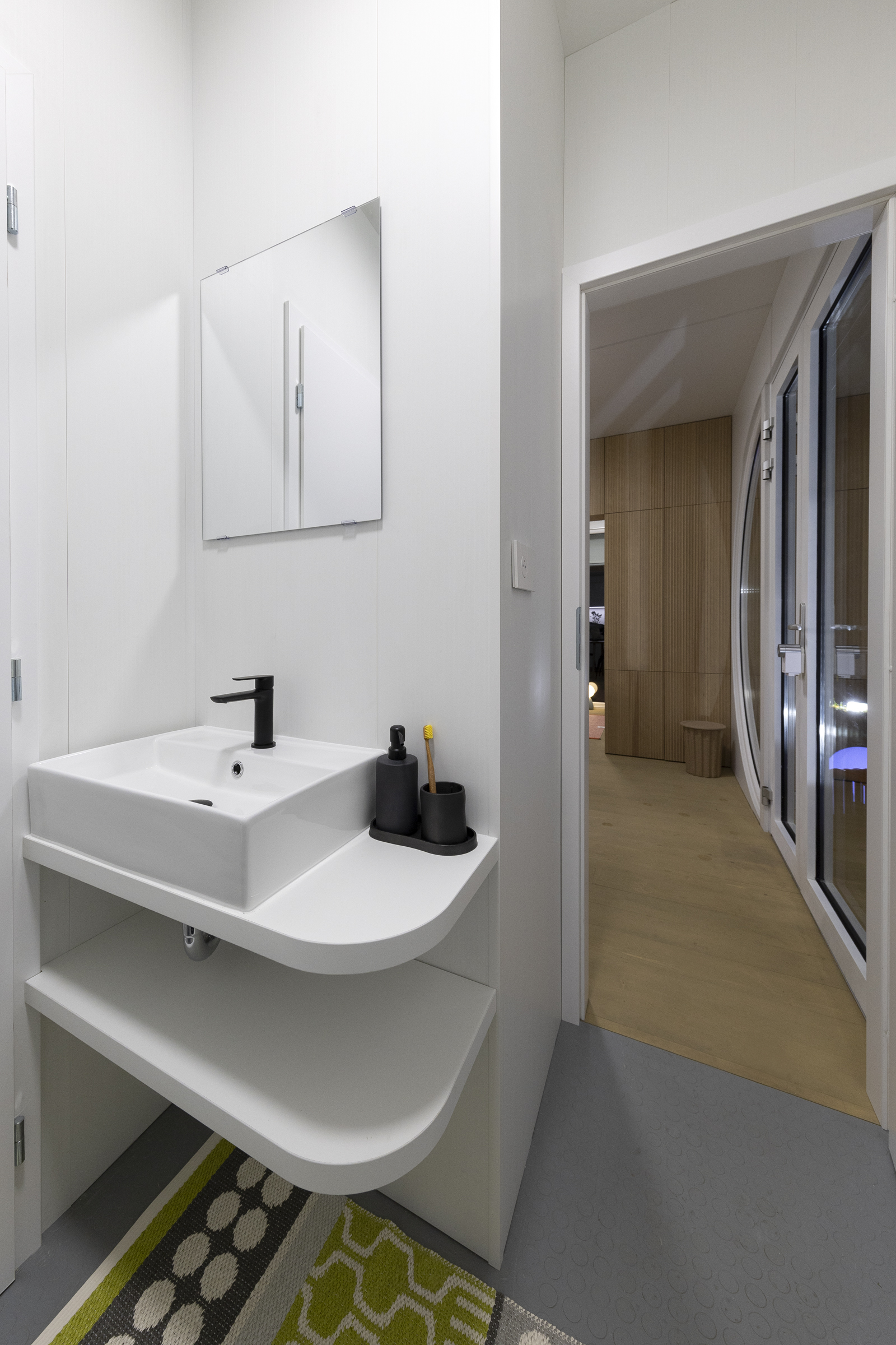 The bathroom is fully equipped with a shower, sink, and storage. You can choose between a standard flush toilet or a chemical toilet. An off-grid water system is also available.