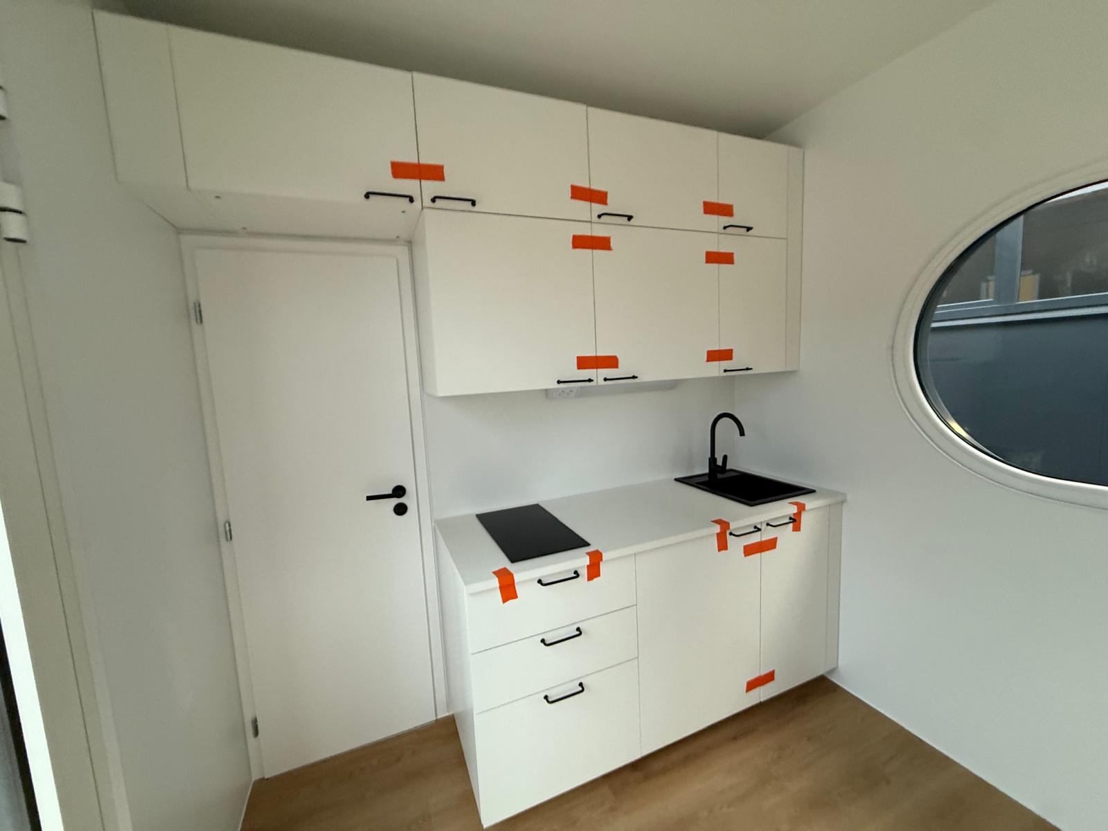 Minimalist kitchen equipped with everything you need for your meals. Induction hob, sink with mixer tap, fridge with freezer, extractor hood and storage spaces.