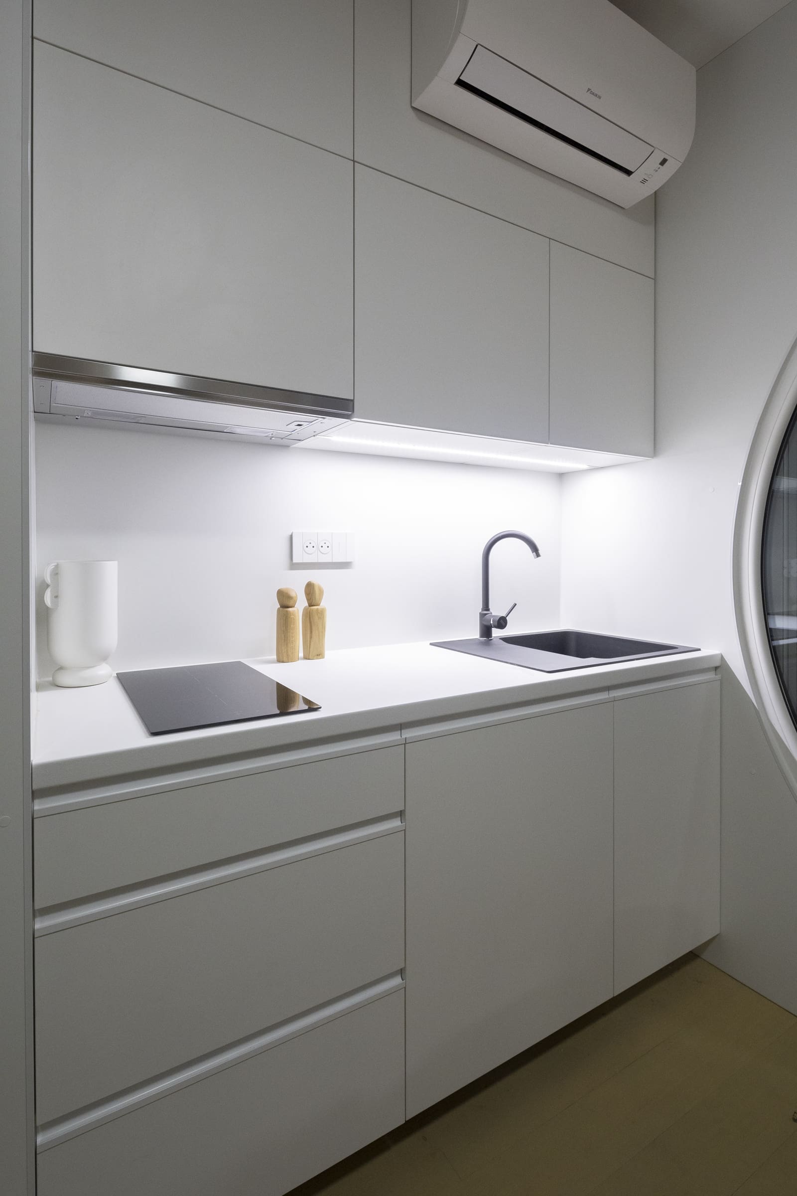 Minimalistická kuchyňa vybavená všetkým, čo potrebujete pre svoje varenie. Indukčná varná doska, drez s batériou, chladnička s mrazničkou, digestor a odkladacie priestory.